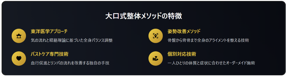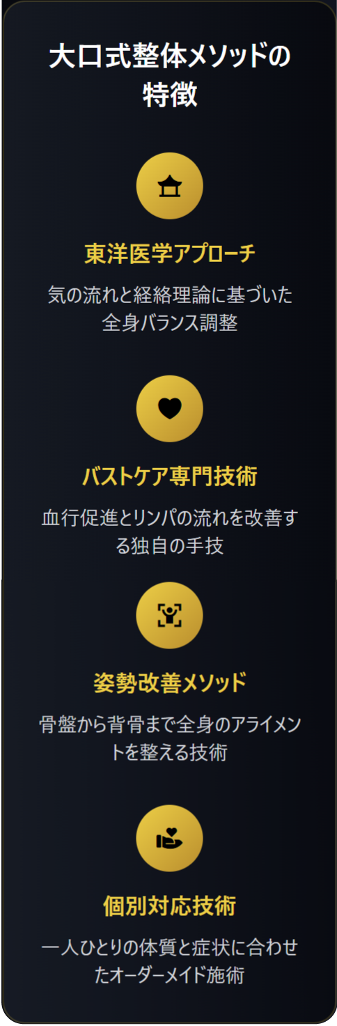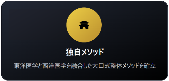 30年以上にわたる豊富な臨床経験を持ち、従来の西洋医学的アプローチに 東洋医学の知恵を融合した独自の大口式整体メソッドを確立。