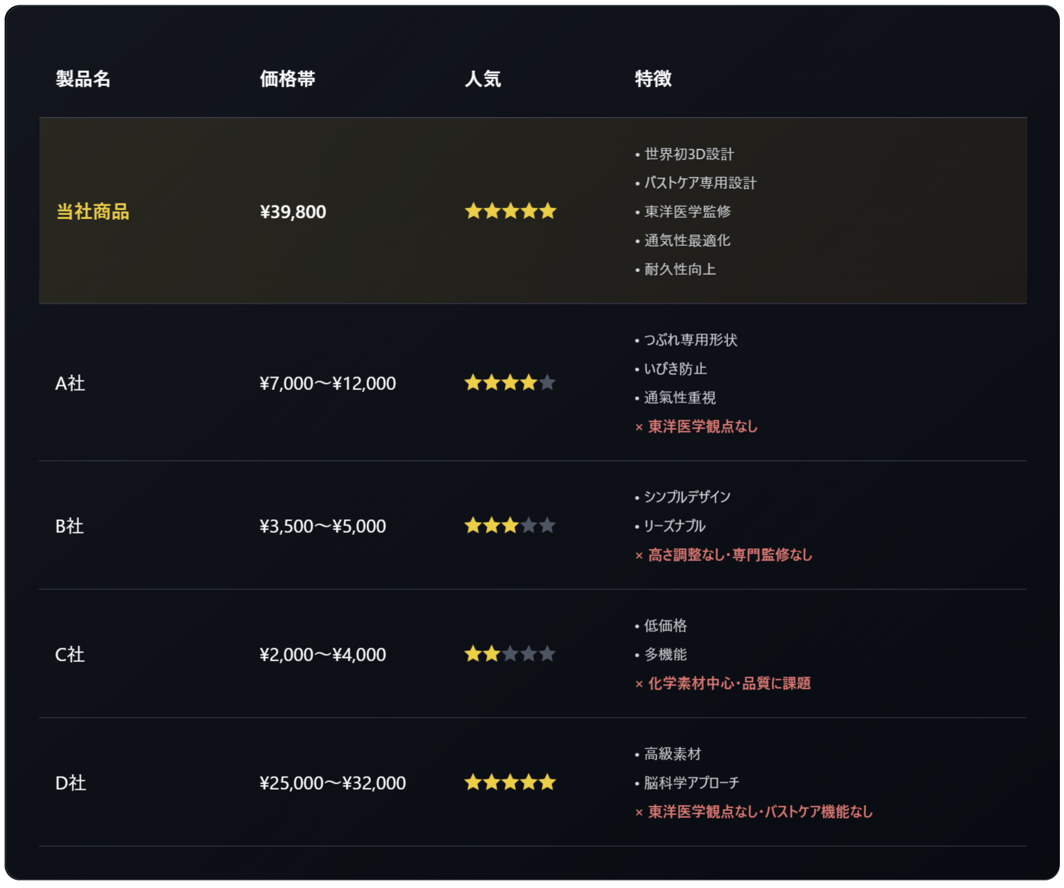 市場の類似商品と比較して、圧倒的な優位性を実現